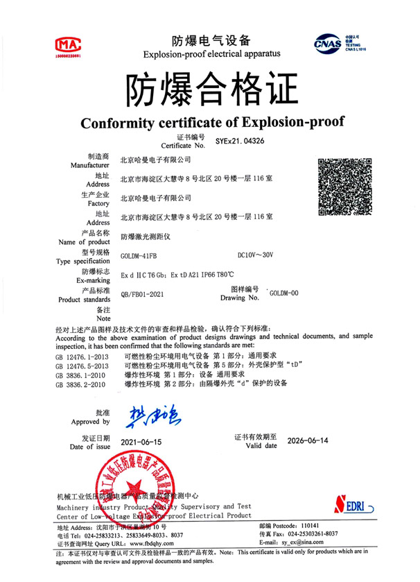 GOLDM-41FB 型防爆设备皮秒激光测距仪首要任务共用以容易引起爆炸声有机废气气体的情况中 1 区或 2 区 IIC 类 T6 组及接下来 的容易引起爆炸声概率公共领域,用以钢铁集团厂、天燃气厂、水泥粉磨厂、打火机油化学工业等易爆公共领域物位、料位及液位的仗量。